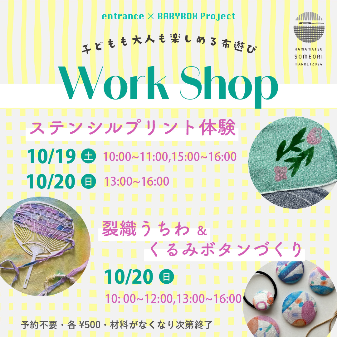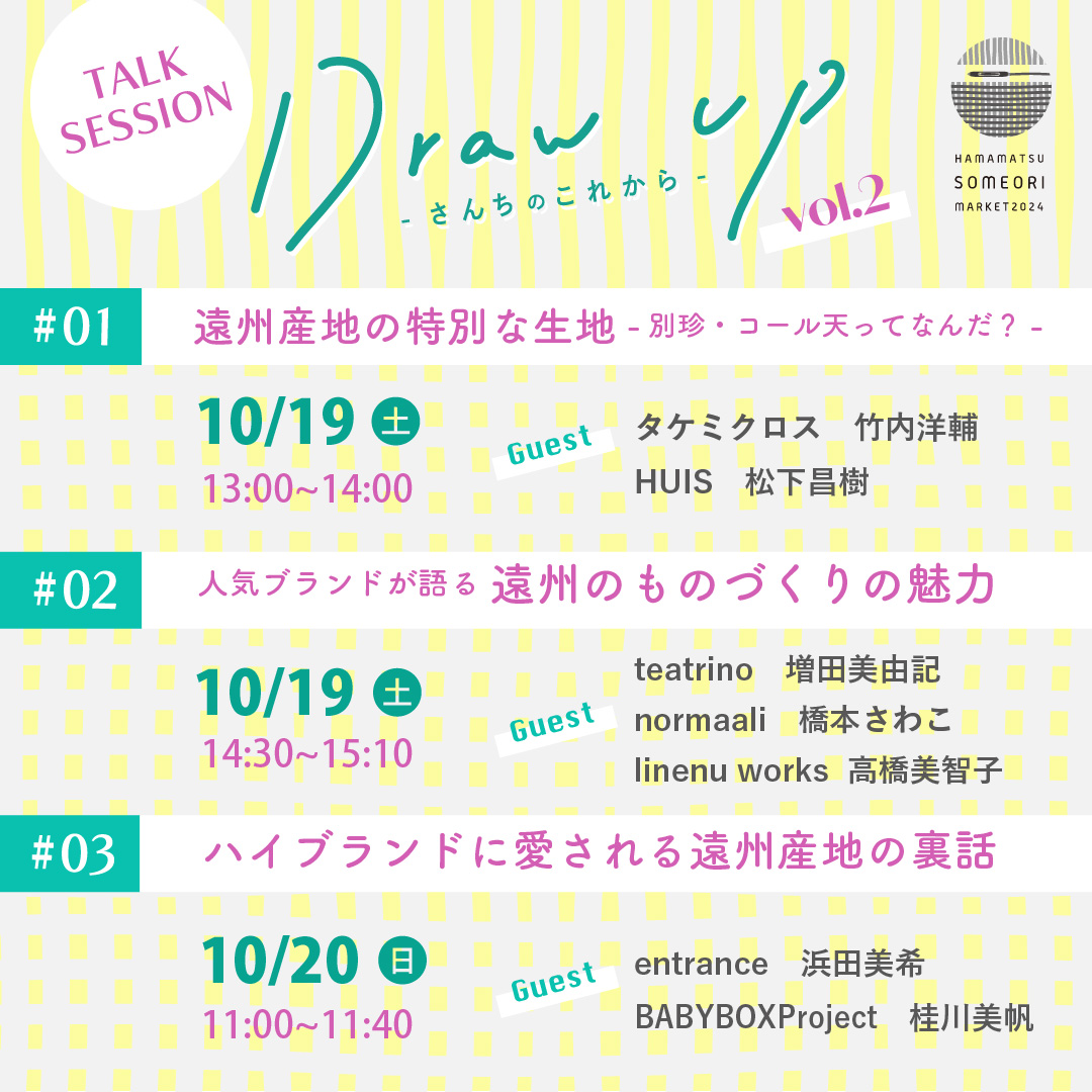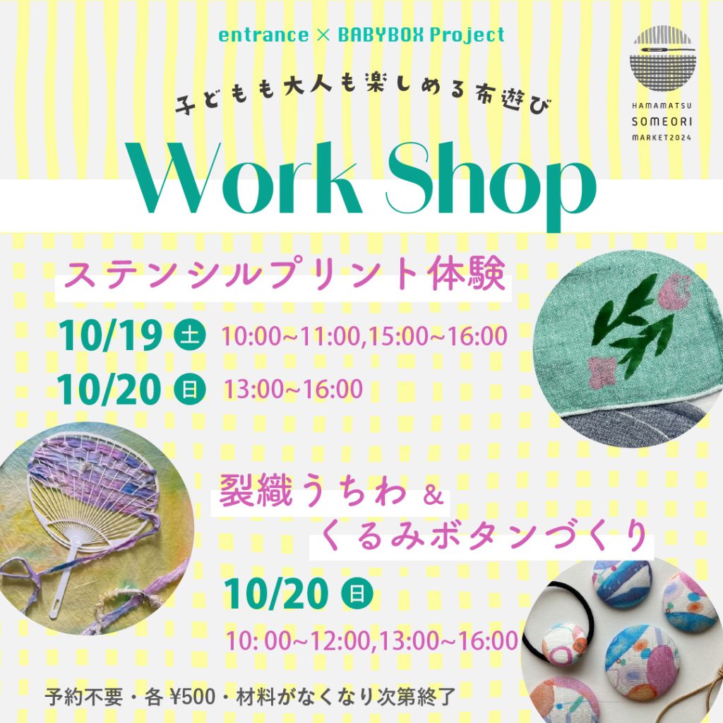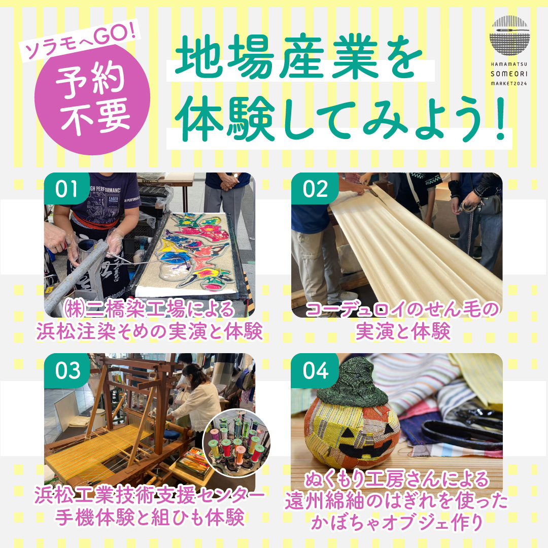 2024年10月1日 / 最終更新日時 : 2024年11月6日 ShinkaiToshikazu イベント情報 はままつ染め織りマーケットに出展いたします 今年も「はままつ染め織りメーケット」に出展いたします。 開催日時:2024年10月19日(10:00~17:00)、10月20日(10:00~16:00) 会場:浜松市ギャラリーモールソラモ・はままちプラス